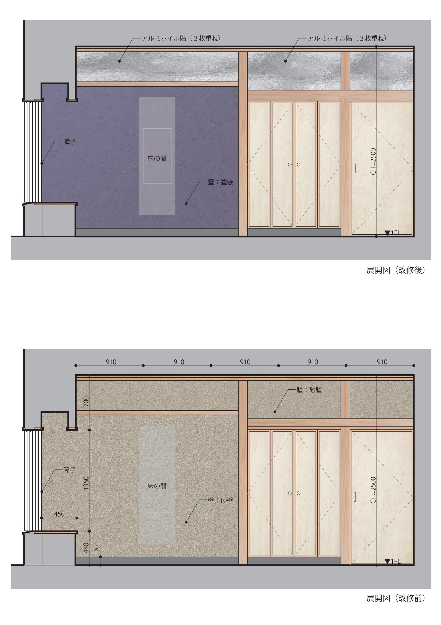 薄暗い客間を、少しでも明るくする方法はないかと模索した。模索した結果として、アルミホイルを部屋の壁の上部に貼ることにした。
